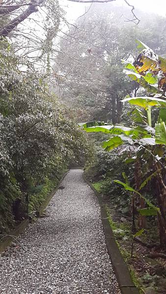 雨漸大,可爬完石階,接下來竟是一段寬闊平坦的碎石子路。雖然撐著傘,寒氣從腳尖慢慢涼了上來,走來卻別有另一番風情:霧氣逐漸瀰漫,樹影濛濛、樹型優美、各具姿態;阿連說這步道宛如她家後花園,即便是盛夏、因林蔭茂密,走來仍覺清涼。