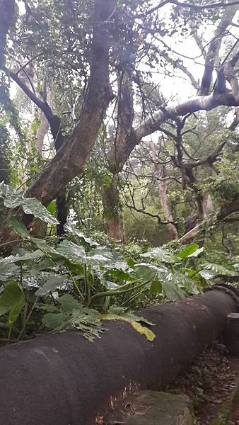 我們先走一小段柏油路面的陡升坡,然後開始爬階;石階面寬、落差小,慢慢爬倒也不覺得累;只是這雨不饒人,躭心濕滑,走得瞻前顧後的。一會兒,一條巨大的粗黑水管以蟠龍之姿佔據石階旁側;大樹枝葉越過它橫向生長,蔓生植物做不了繞指柔,只能沿管壁披掛下來;聽不到粗黑水管內的轟隆水聲,是被雨聲所蓋,還是被一群女人的笑鬧聲所掩?侯ㄇㄟ補充說道,天母東西路竟會因飲用水源不同而有租屋價的落差,猜猜看,飲用湧泉水租屋價高或較低?