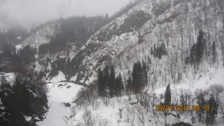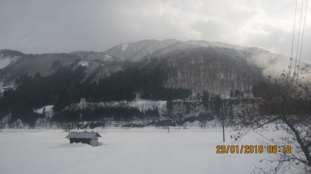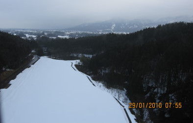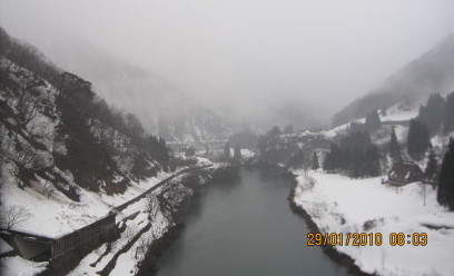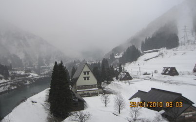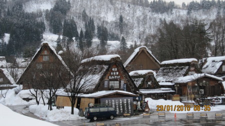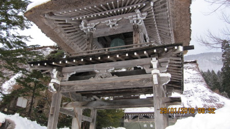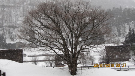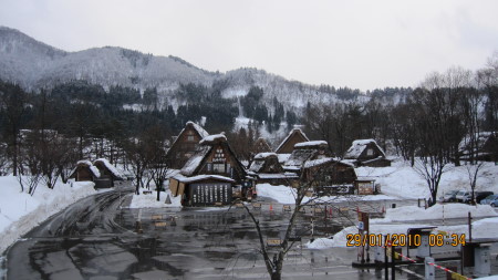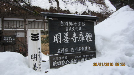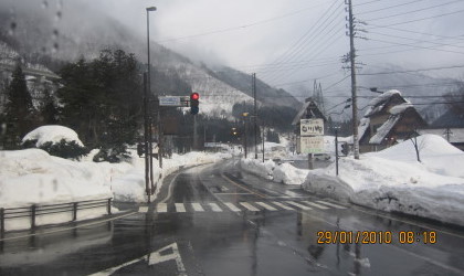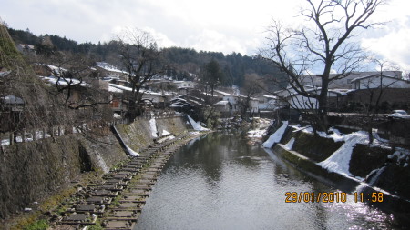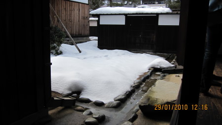 這是高山陣屋的一景,中庭全積滿了白雪,管理人員處理得很好,週邊的石頭排水溝都把雪清乾淨,以便排水。