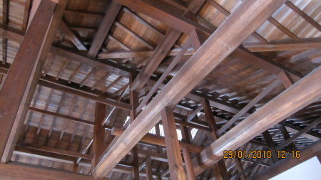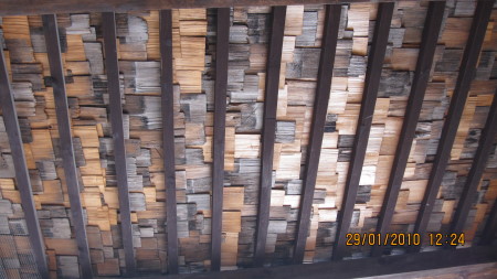 屋頂層疊的木片,組合成一幅特殊的設計圖。
