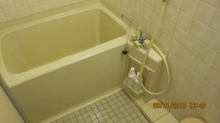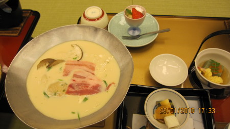 晚上在下呂溫泉望川館住宿。這是浴室設備,備好公用的沐浴乳與洗髮精。這裡除了公共浴堂是溫泉外,房間裡不提供溫泉,所以就只能去泡湯了。這真是生平第一次經驗,在他人面前脫光成一絲不掛,真是要很有勇氣。浴堂裡煙霧瀰漫,要先在旁邊小板凳上坐著,淨身沐浴,再把毛巾包在頭上,慢慢步入浴池。真是溫暖的大澡堂啊!女兒還在池裡游泳呢!我們四人還到室外池泡湯,水溫很高,抬頭看見月亮高掛在天上,星光點點,心中湧起一種特殊的感覺,永難忘懷這番情景。