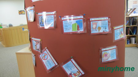 圖書館使用規則,逐條採用圖文解說,張掛在柱子上。