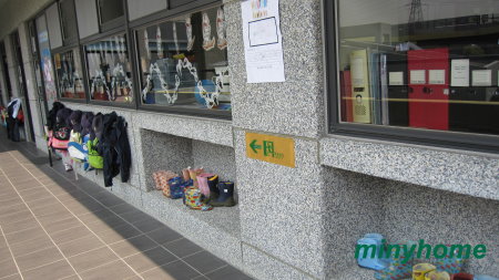 走廊旁的牆壁有創意,如壁櫃班可放置鞋子物品等,書包全掛在教室外。