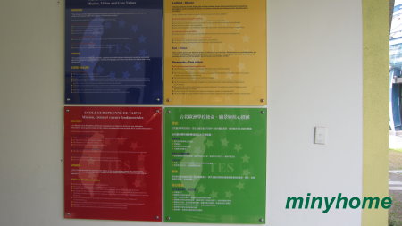 以中英德法四個國家的語言顯示學校的願景,四個顏色呈現,掛在走廊牆壁上。
