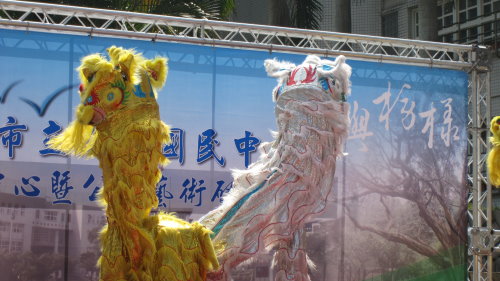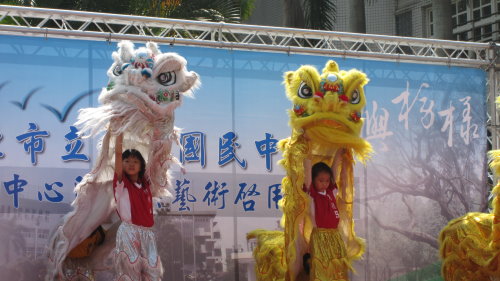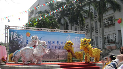 今天對成德國中而言,真是個大日子,因為興建二年的活動中心終於落成,歷任校長、教育局長官、社區里民、全校學生共同參與這場盛會。同時辦理公共藝術啟用典禮,本校舞獅團便是參與這個典禮。